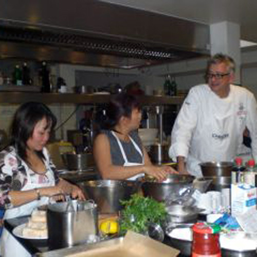 Nördlingens Sternekoch Joachim Kaiser lädt gerne zu sich in Meyers Keller ein und kocht gemeinsam mit ausgewählten Gruppen. Dreimal hatte er die Frauen von Interkulturellen Frauencafé zu Gast. Entstanden ist dabei u. a. ein Menü mit 7 Gängen aus 7 Ländern.